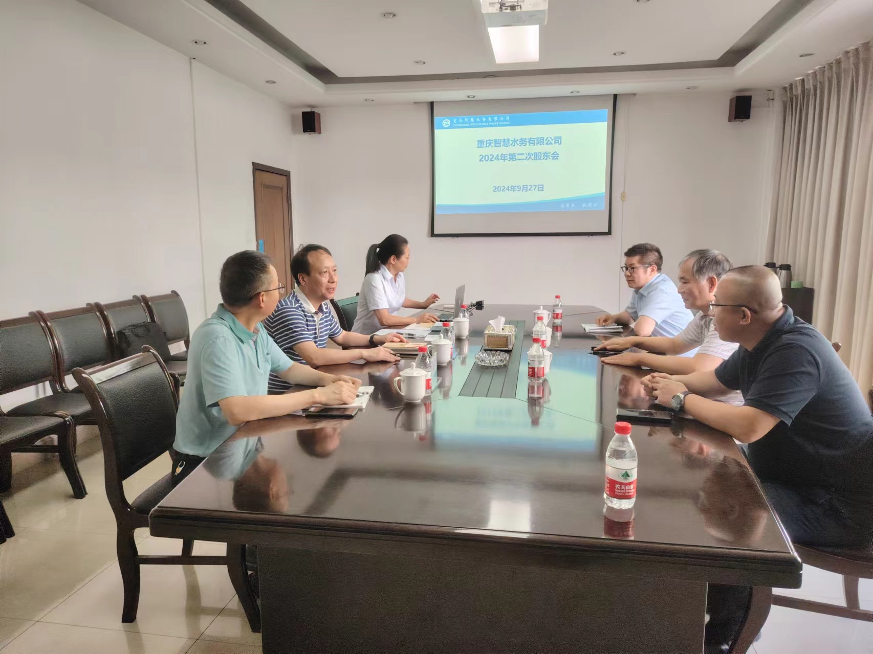 2024年9月27日下午,智慧水務公司在辦公大樓會議室順利召開2024年第二次股東會及四屆一次董事會,公司董事長李加林同志主持會議,會議選舉產生了公司新一屆董事、董事會。
