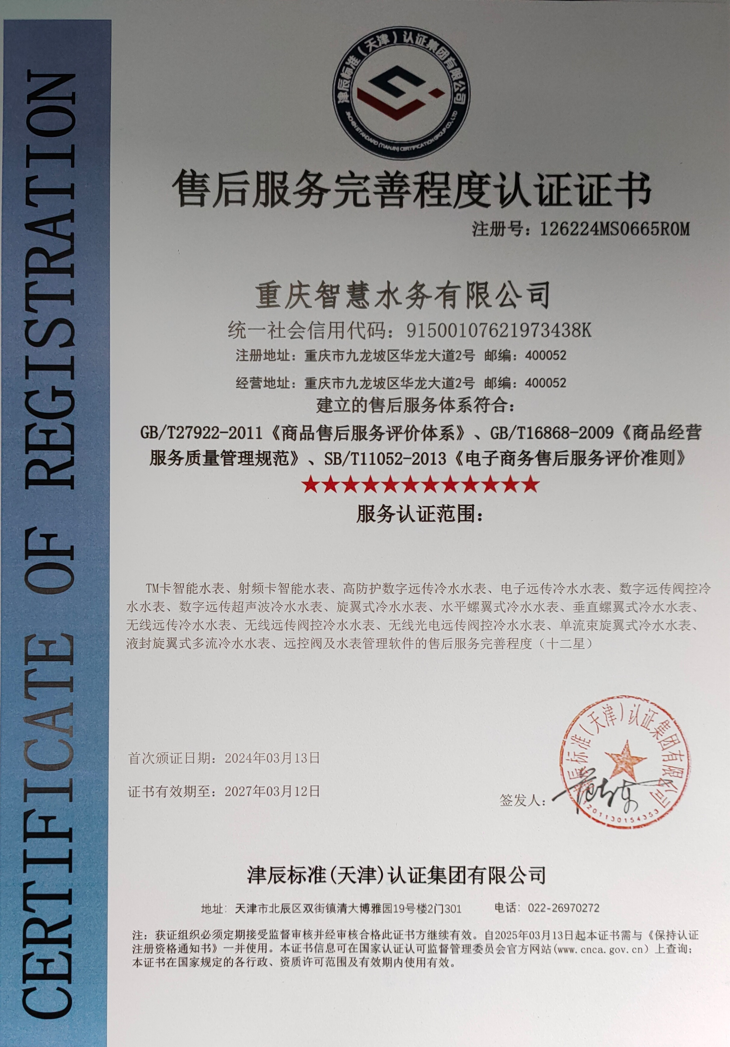 近日,重慶智慧水務有限公司榮獲“售后服務完善程度認證12星”。該認證體系基于國際標準和行業最佳實踐建立,涵蓋了服務響應速度、技術支持能力,產品維護和升級服